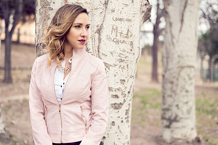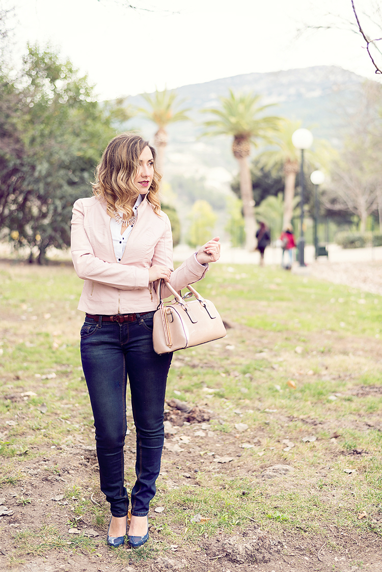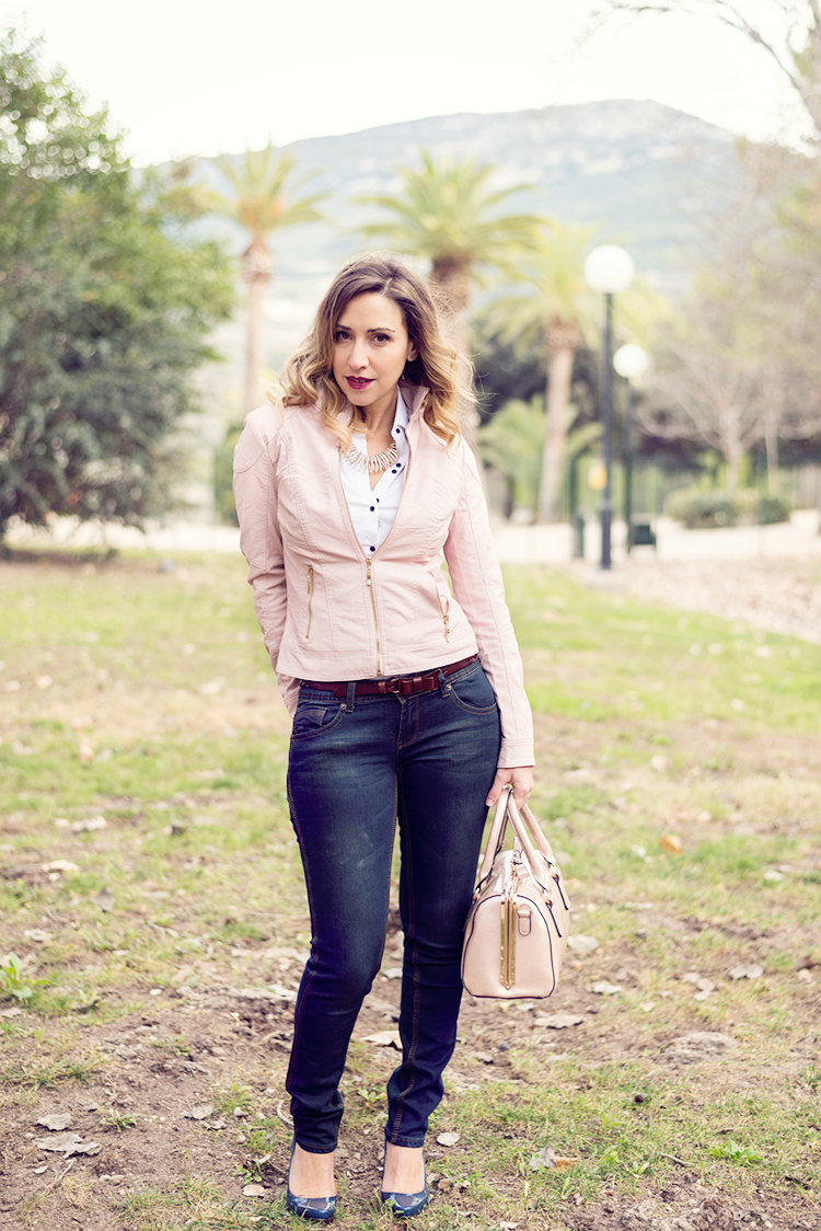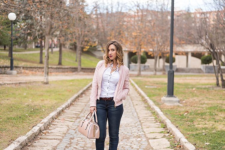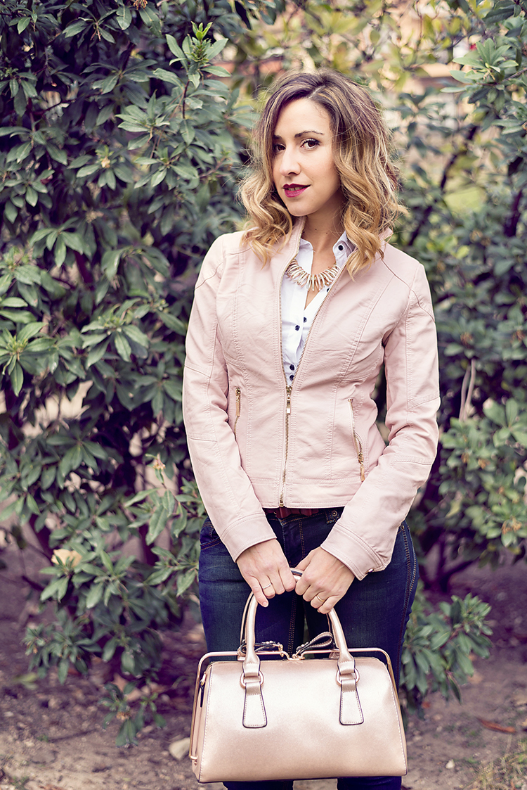 Para esta ocasión he elegido un look básico con jeans push up, camisa blanca elástica y chaqueta de polipiel rosa palo.
