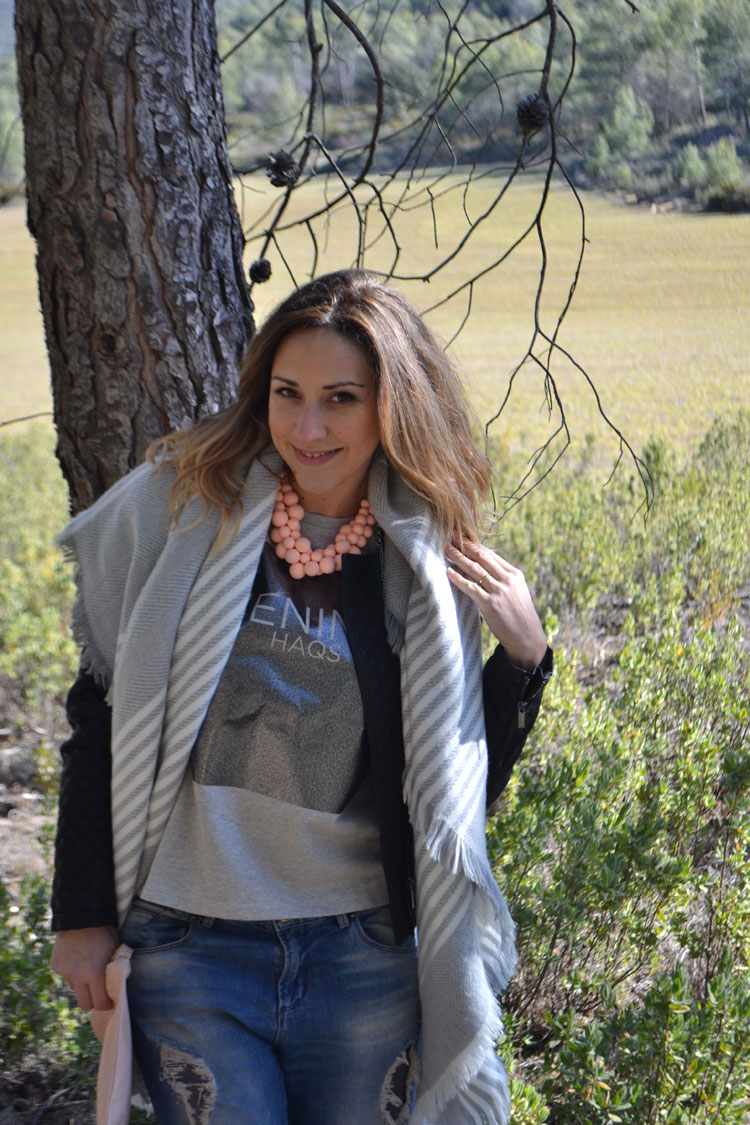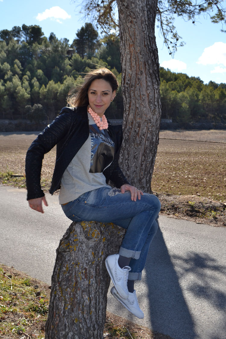 Pasando mucho frío supongo, las temperaturas están bajando, está haciendo mucho viento y hay que llevar prendas que abriguen. Así que he elegido este look con sudadera y biker jacket de imitación cuero que no deja pasar el aire, con bufanda manta que es la salvación para estos días, jeans boy friend y zapatillas blancas que veremos en muchos looks, tanto urbanos como de working style.