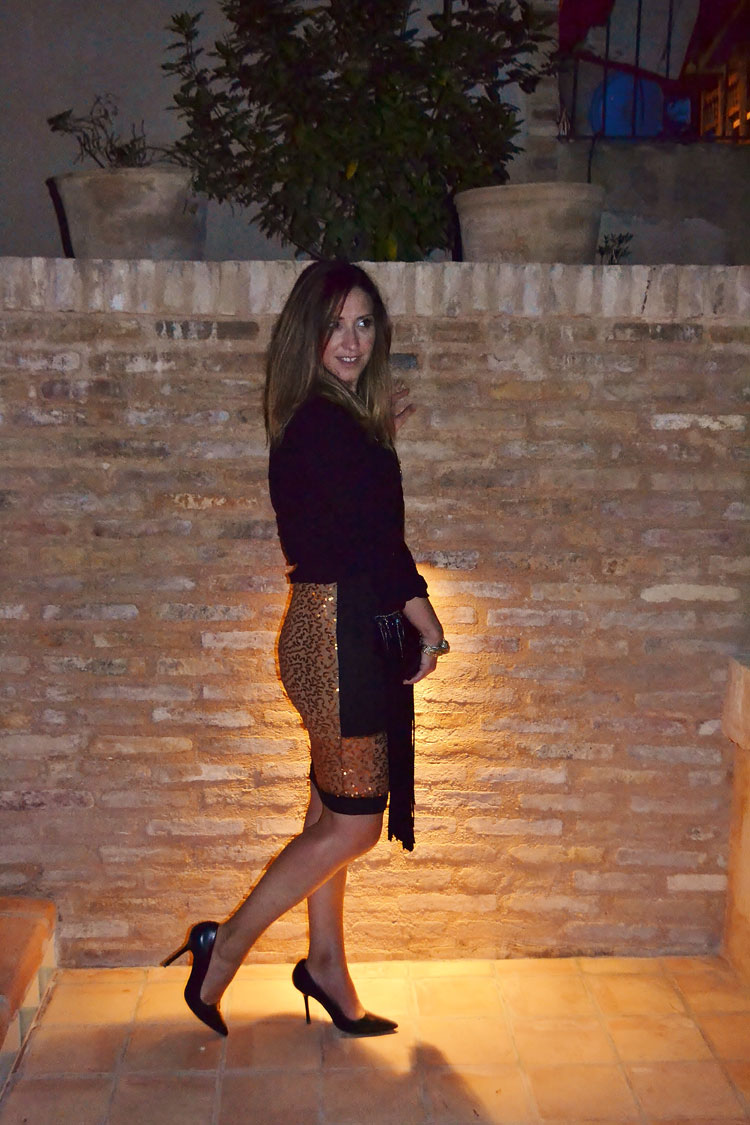 Para asistir al desfile lucí una falda tubo reversible de la colección Avance Diva Night de AF con la parte de atrás de lentejuela cuadrada y con detalle delantero de transparencias, que combiné con una camisa básica y un collar boho chic.