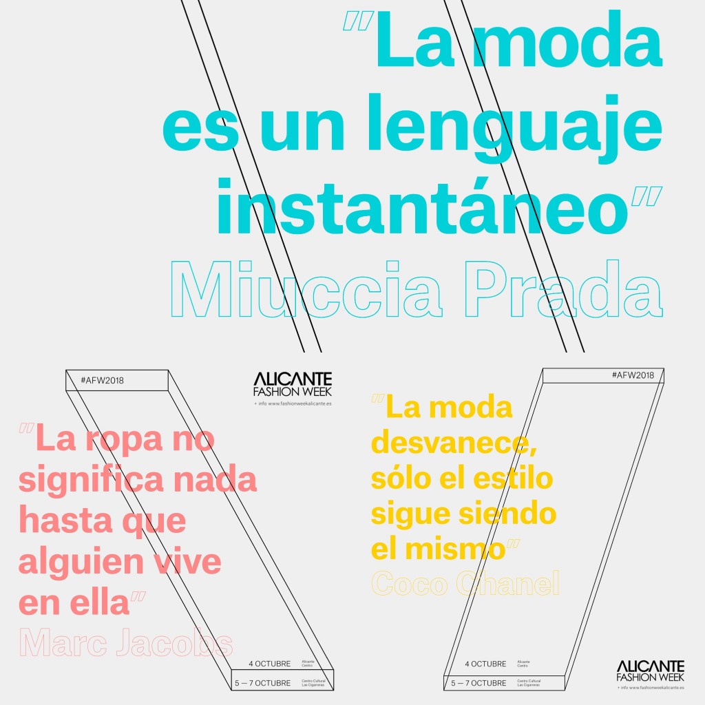 Allí las organizadoras del evento Marta y Natalia nos presentaron la programación que ocupará los cuatro intensos días llenos de moda que arrancarán el jueves 4 de octubre en pleno centro de la ciudad de Alicante y seguirá en su ubicación habitual el viernes 5 de octubre en el Centro Cultural Las Cigarreras hasta el domingo día 7. Acompañarán todos los eventos estos carteles con tres frases de grandes diseñadores. ¡Me encantan!