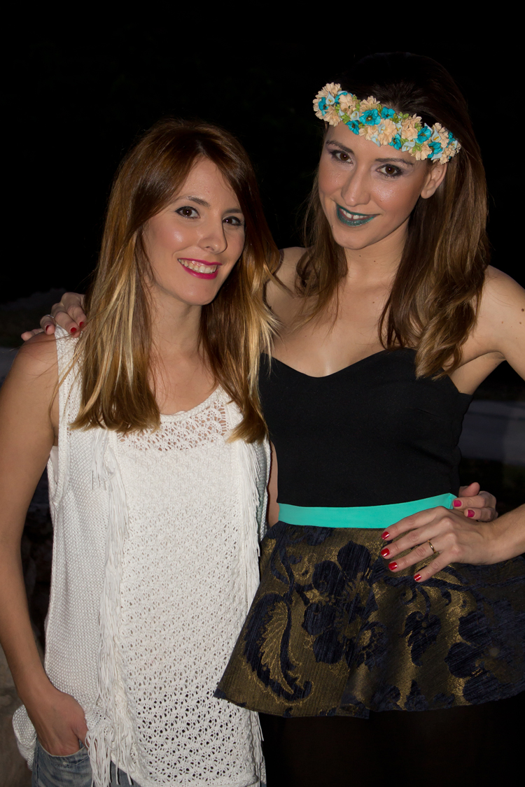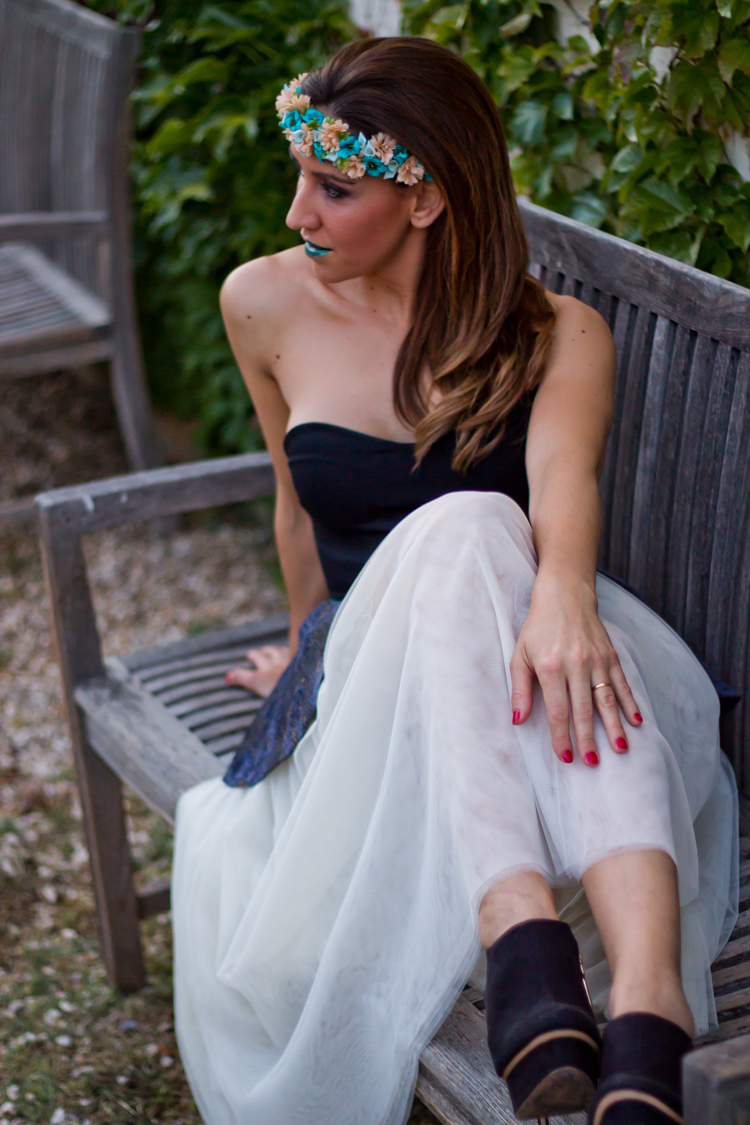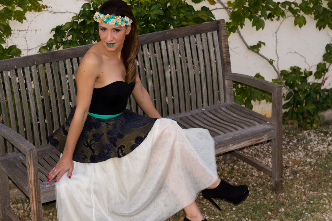 Como complementos le añadimos una preciosa y delicada corona de flores multicolor de la floristería ‘La Barraca’ y unos botines con tacón y plataforma negros.