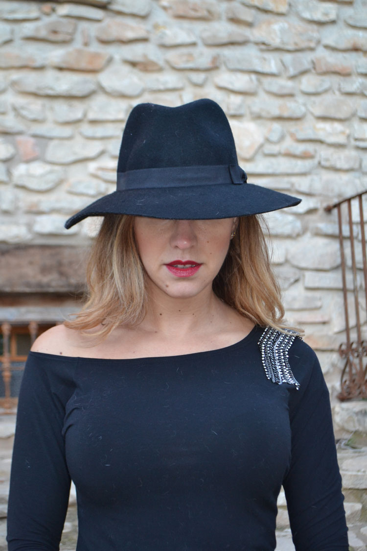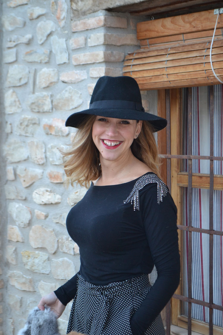 Para esta ocasión mi ‘outfit’ elegido fue un pantalón palazzo negro con lunares blancos de talle alto, combinado con camiseta con escote asimétrico y con aplicación joya en uno de los hombros, de Haqs, ¿no creéis que es una preciosidad de camiseta?