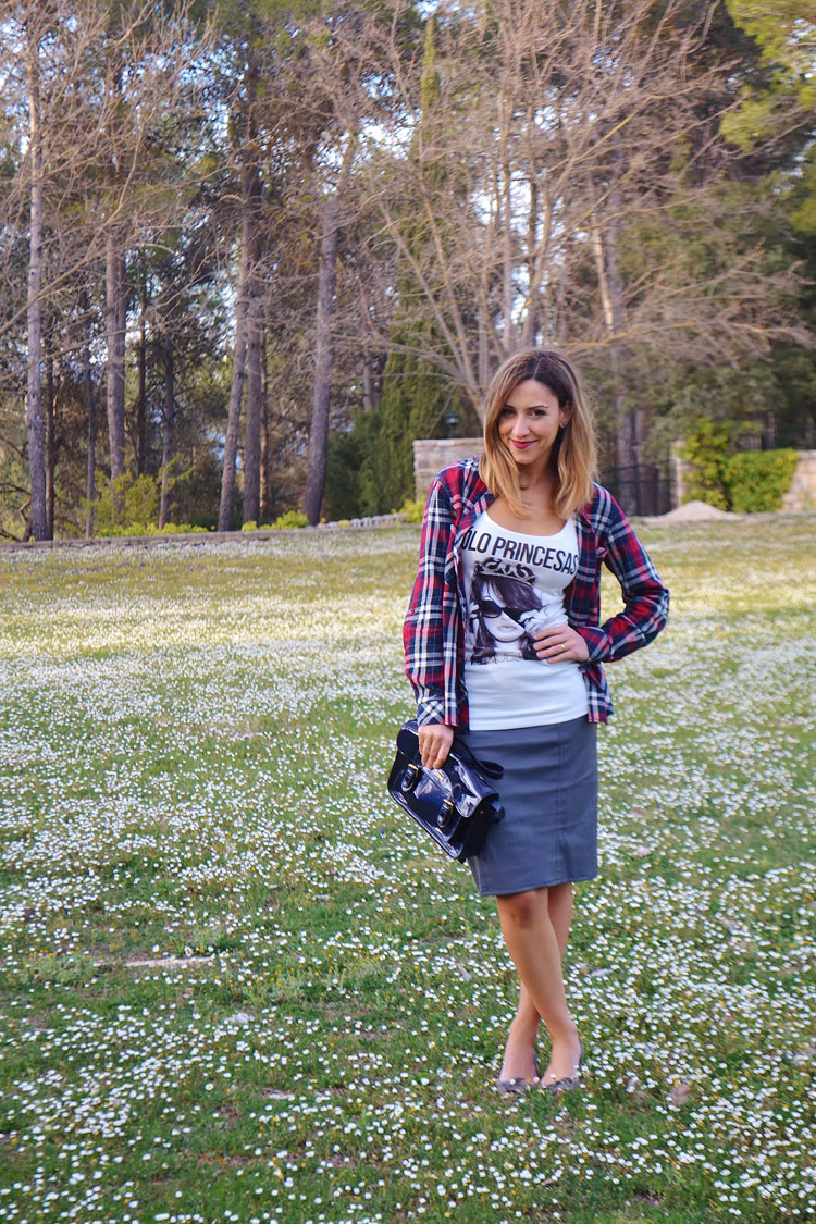 Hoy he decido ponerme una falda imitación cuero en gris, muy cómoda por cierto, porque es elástica, con camiseta ‘Sólo Princesas’ a la cual le estoy cogiendo mucho cariño y me la pondría con todo y camisa tartan que más de lo mismo, necesito comprarme camisas de cuadros de más colores… jejeje, ¡combinan con todo!